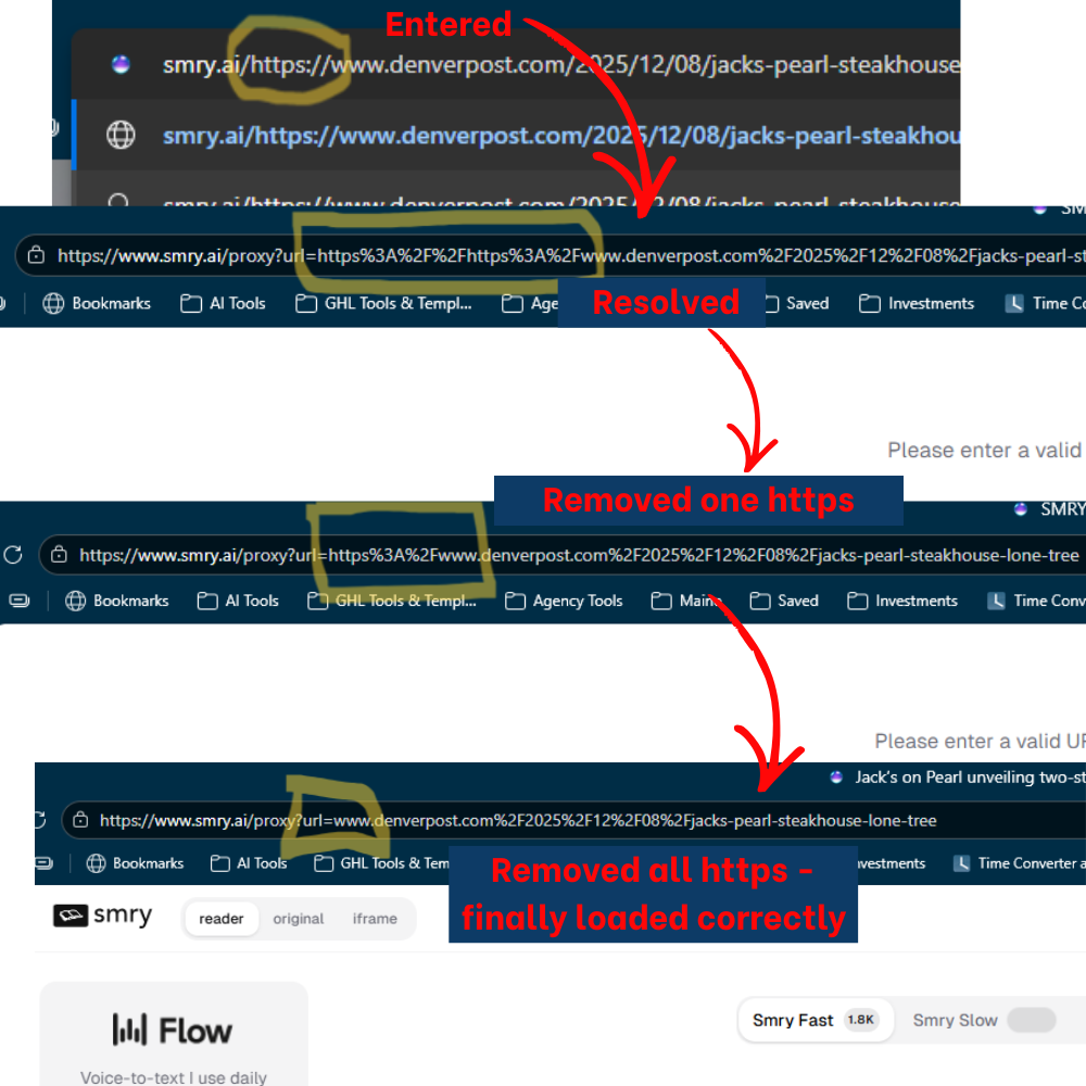 Any address being added via address bar (ie: smry.ai/[website url]) that is including https:// is not resolving correctly. See image.